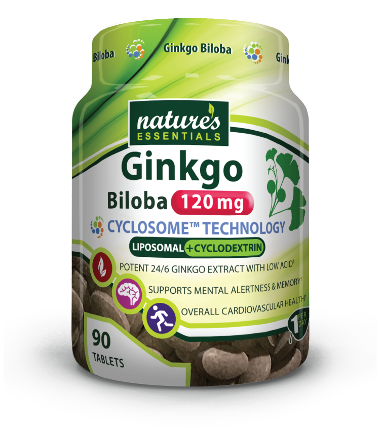 The leaves from the Ginkgo Biloba tree have been used in Chinese medicine for thousands of years to support memory, brain function, cognitive speed, and improved circulation to the extremities. Nature’s EssentialsTM Ginkgo Biloba is a high-quality standardized extract with low acid combined with the most advanced delivery technology on the market so that you can ABSORB MORE. Natural liposomes protect the Ginkgo Biloba and a beneficial starch called cyclodextrin provides a more bioavailable Ginkgo Biloba so you get more of the good stuff.†