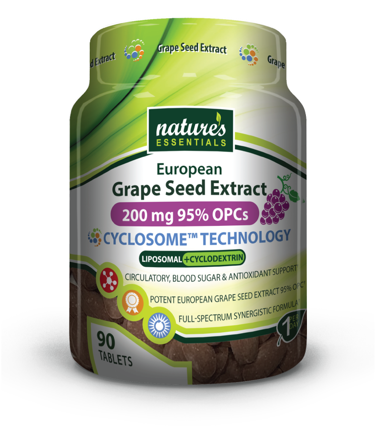 Grape seeds have been used traditionally for thousands of years in Europe and studied for their powerful antioxidant benefits, including phenolic acids, anthocyanins, flavonoids and oligomeric proanthocyanidin complexes (OPC’s) or plant metabolites. Nature’s Essentials uses the highest quality full-spectrum European grape seed extract with 95% OPC’s including additional healthy plant metabolites for a more synergistic formula. Our scientifically advanced Cyclosome™ technology sets our ingredients apart using natural liposomes to protect the grape seed extract through digestion and a starch cyclodextrin for optimal absorption. Introducing the most bioavailable Grape Seed Extract on the Market.†